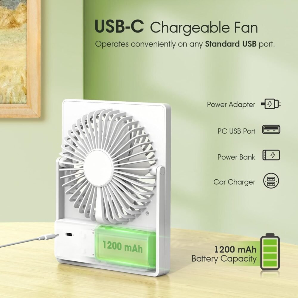 • Cordless and Rechargeable: With a built-in 1200 mAh battery, the portable fan is perfect for outdoor and operates at a maximum running time of 4.5 hours at low speed. The USB-C charging cable is included for battery charging.