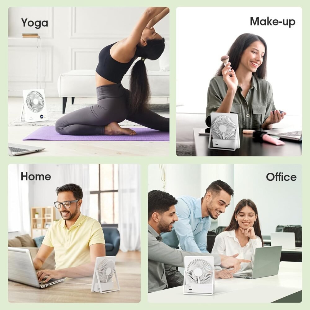 • 180°Stand Tilt Angle: The personal fan’s back stand allows you to rotate it 180°, providing the flexibility to adjust the wind angle according to your needs. Also, the back stand can be folded away to save storage space when not in use.