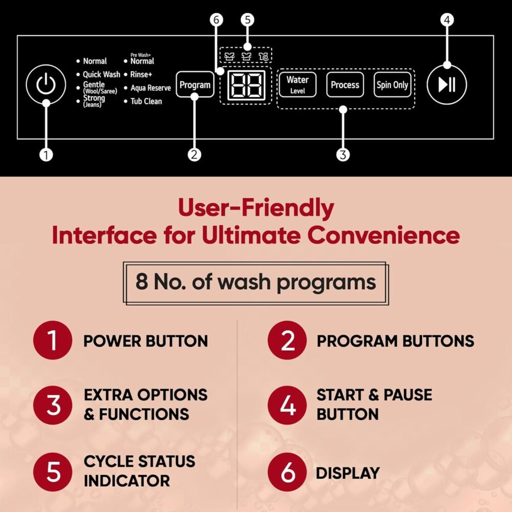 • Wash Programs: 08 No. of Programs – Normal: built-in sensor detects the weight of the clothes, calculating wash, rinse and, spin settings accordingly | Quick Wash : Use this programme to wash lightly soiled clothes for a short time | Gentle(Wool/Saree): this programme to wash delicate fabrics such as lingerie and woolens | Strong: this programme for heavily soiled durable garments such as overalls, jeans | Pre-wash+Normal: this programme to pretreat immediate stain without handwash | Rinse+: This program will run same as Normal course with one extra rinse for all water levels | Aqua Reserve | Tub Clean: This is a special function to clean inside the drum of your appliance